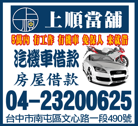 名稱:上順當舖描述:專業當舖服務南屯區、南屯區汽機車借款、南屯區房屋借款、南屯區低利息、南屯區南屯當舖、黃金鑽石借款電話:04-23200625地址:台中市南屯區文心路一段490號